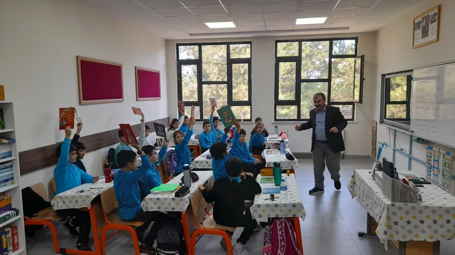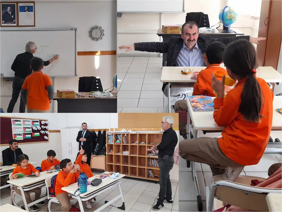 İlkokul düzeyinde eğitim gören çocukları sınıflarında ziyaret eden Prof. Dr. Mustafa Böyükata ve Prof. Dr. Duran Karakaş, öğrencilerin neşesine ortak oldular. Adeta “Sokratik bir yöntemle” sürekli sorular soran Prof. Dr. Mustafa Böyükata, bazı sınıflarda öğrencilerin standart olmayan ölçme ile standart ölçmeyi fark etmelerini sağlamaya çalıştı, kimi sınıflarda matematiğe dair ve kimi sınıflarda coğrafi bilgileri konuşmasına kattı. Akademisyenler bilim insanlarından bahsedip, İbn-i Sina gibi, Aziz Sancar gibi öncü bilim insanlarının da benzer sıralardan geçtiklerini hatırlatıp kendi deneyimlerinden de bahsettiler ve çocukların sorularına cevaplar verdiler. Çoğunlukla oyun oynar gibi bir dil kullanılan söyleşilerde çocukların neşesinin katlanarak arttığı gözlendi. Ayrıca öğrenciler için hediye kitap da bırakıldı. Bu kitapların temininde bulunan Berlin’den Adem Karaca ve Doç. Dr. Handan Yalvaç Arıcı ile arkadaşlarına da gıyabında teşekkür edildi.