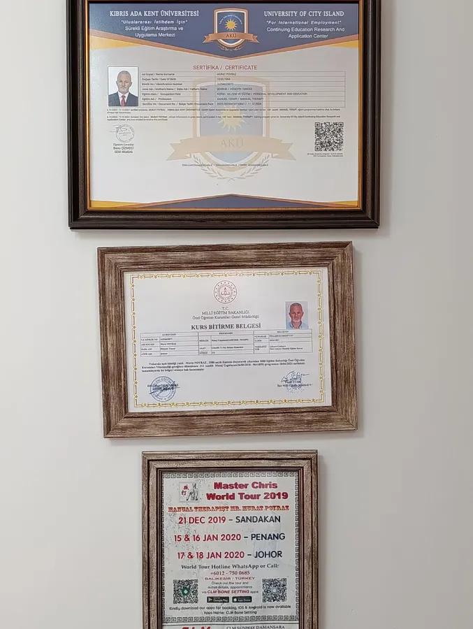 Murat POYRAZ: Yurtdışında olduğum bir gün aniden bende İnsan anatomisi üzerine çok ciddi bir merak uyandı ve uzman bir masör olarak kişilere nasıl hizmet verebilirim, ağrılarının giderilmesi için nasıl faydalı olabilirim diye düşünürken karşıma Malezya'da Master Chris Long çıktı. Pandemi döneminden önce Malezya'da Online olarak derler aldım ve Yüksek derecede belge sahibi oldum. Daha sonra bu belgeler beni, kesmedi Ankara'da Milli Eğitim Bakanlığı'nın açmış olduğu uzman masörlük kursundan Başarılı bir şekilde mezun oldum ve Milli Eğitim Bakanlığı onaylı klinik açma belgesi aldım 2018'de pandemi döneminde Balıkesir merkezde çeşitli Ağrı sıkıntıları olan danışanlarımıza hizmet vermek için bir iş yeri açtım Sonrasında manuel masajla ilgili Kıbrıs Akdeniz Üniversitesi'nden yaklaşık 687 saat eğitim alarak (ömür boyu) manuel terapi sertifikasına sahip oldum
