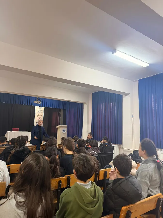 Milli Eğitim Bakanlığı tarafından okullarda yürütülen “Dilimizin Zenginlikleri” projesi kapsamında Menderes Süleyman Çevik Ortaokulu öğrencileriyle buluşan yazar A.Levent Ertekin öğrencilere yüzyıllar boyu çok geniş bir coğrafyada Türkçenin geçerli bir dil olduğuna temas ederek örneklerle öğrencilere dilimizin güzelliklerinden örnekler verdi.