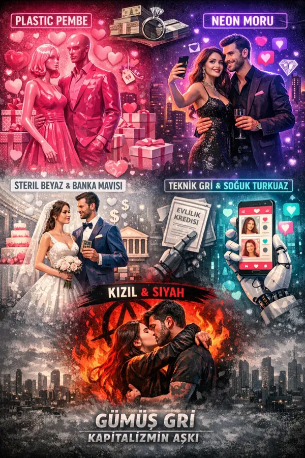 Kapitalist düzende aşk, özgür bir bağ olmaktan çıkarak tüketilebilir bir ürüne dönüşür. Bunun en görünür rengi Plastik Pembedir. Sevgililer Günü reklamlarında karşımıza çıkan bu pembe; sıcaklığın değil, seri üretim romantizmin rengidir. Göz alıcıdır ama içi boştur, parlaktır ama derinliği yoktur.
