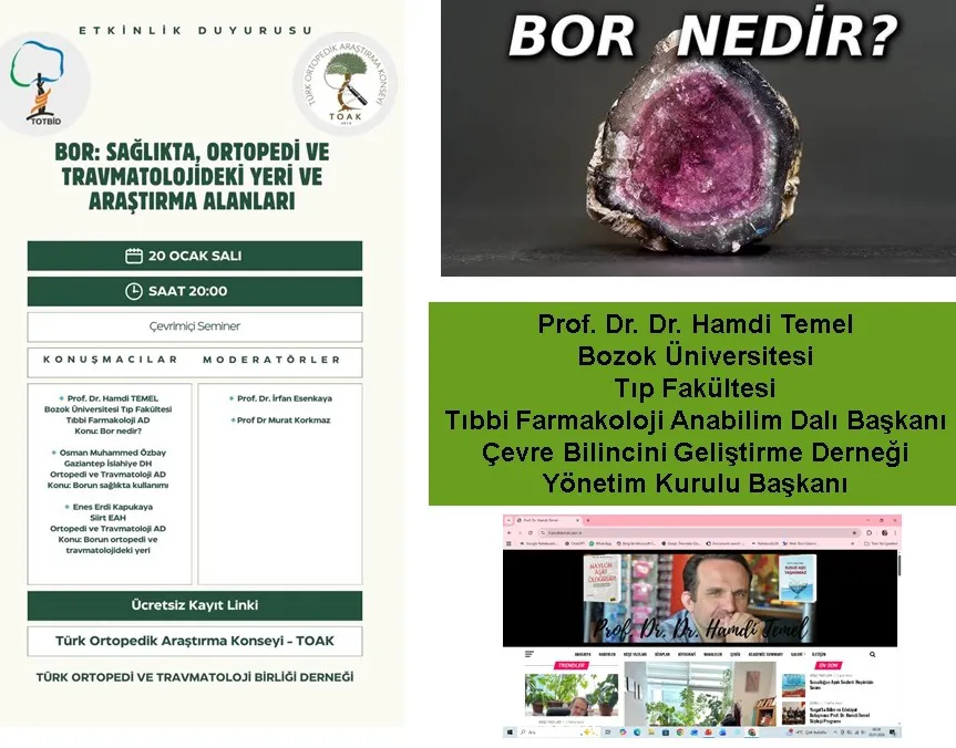 Türk Ortopedi ve Travmatoloji Birliği Derneği (TOTBİD) ve Türk Ortopedik Araştırma Konseyi (TOAK) iş birliği ile düzenlenen çevrimiçi seminerde, "Bor: Sağlıkta, Ortopedi ve Travmatolojideki Yeri ve Araştırma Alanları" başlığı altında bilim dünyası bir araya geldi. 30’un üzerinde seçkin akademisyenin katılımıyla gerçekleşen etkinlikte, bor mineralinin tıbbi geleceği tüm yönleriyle tartışıldı.