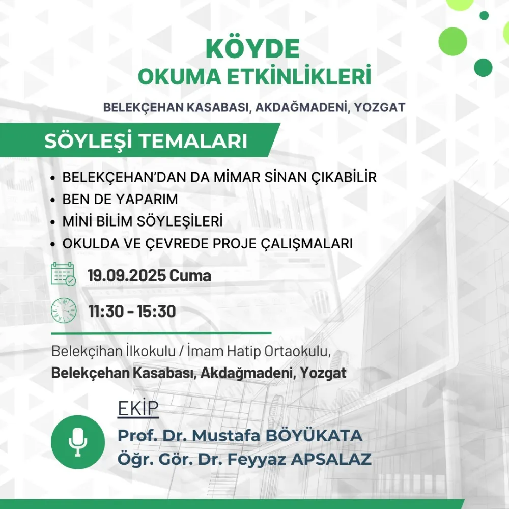 Belekçihan İlkokulu / İmam Hatip Ortaokulu Müdürü Sonar Yapar’ın davetleri üzerine gidilen okulda Prof. Dr. Mustafa Böyükata ile birlikte YOBÜ Akdağmadeni Sağlık Yüksekokulu’ndan Doç. Dr. Soner Özen ve Akdağmadeni Meslek Yüksek Okulu’ndan Öğr. Gör. Dr. Feyyaz Alpsalaz ile Elektrik ve Enerji Bölümü öğrencileri Tuncay İlbay, Ramazan Bayazit ve Talha Dağcı da etkinliklerde yer aldılar. "Belekcehan’dan da Mimar Sinan çıkabilir" mottosu etrafında söyleşiler gerçekleştirip çocukların bilim ve teknolojiye yönleik motivasyonlarını artırmaya çalıştılar.