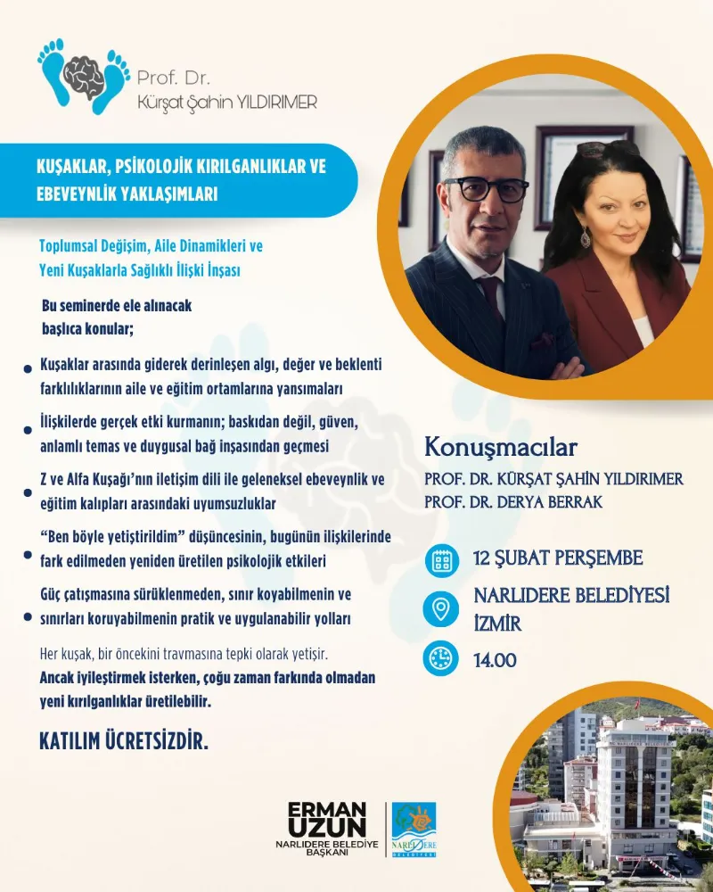 Narlıdere Belediyesi’nin katkıları ve Narlıdere Belediye Başkanı Erman Uzun’un destekleriyle, “Kuşaklar, Psikolojik Kırılganlıklar ve Ebeveynlik Yaklaşımları” başlıklı seminer, Narlıdere’de gerçekleştirilecek.