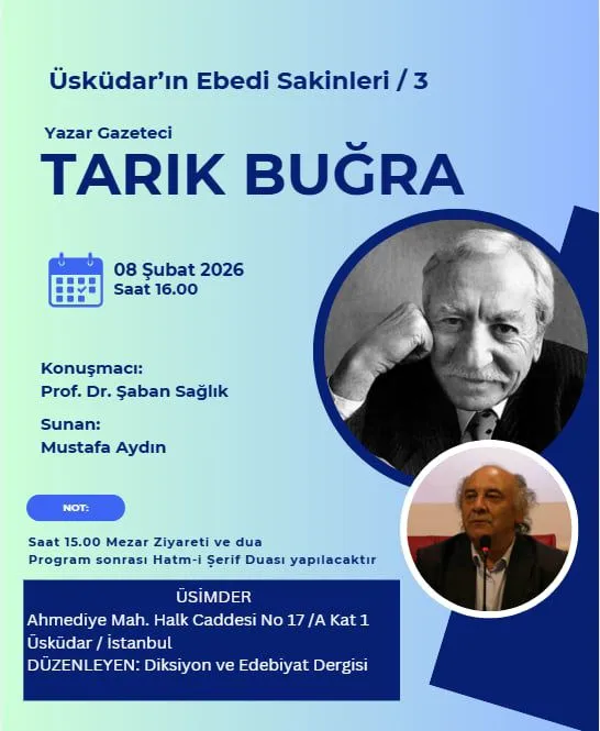 “Üsküdar’ın Ebedî Sakinleri” toplantılarının üçüncüsünde Küçük Ağa romanın ve birçok kıymetli eserin yazarı Tarık Buğra, bugün (8 Şubat 2026 Pazar) rahmetle ve şükranla yâd edilecek. Buğra’yı Prof. Dr. Şaban Sağlık anlatacak. Mustafa Aydın’ın takdimini yapacağı, Diksiyon ve Edebiyat Dergisi’nin düzenlediği “Üsküdar’ın Ebedî Sakinleri” toplantısı, ÜSİMDER’de (Ahmediye Mahallesi, Halk Caddesi, No. 17/A Kat 1 Üsküdar-İstanbul) saat 16.00’da başlayacak.