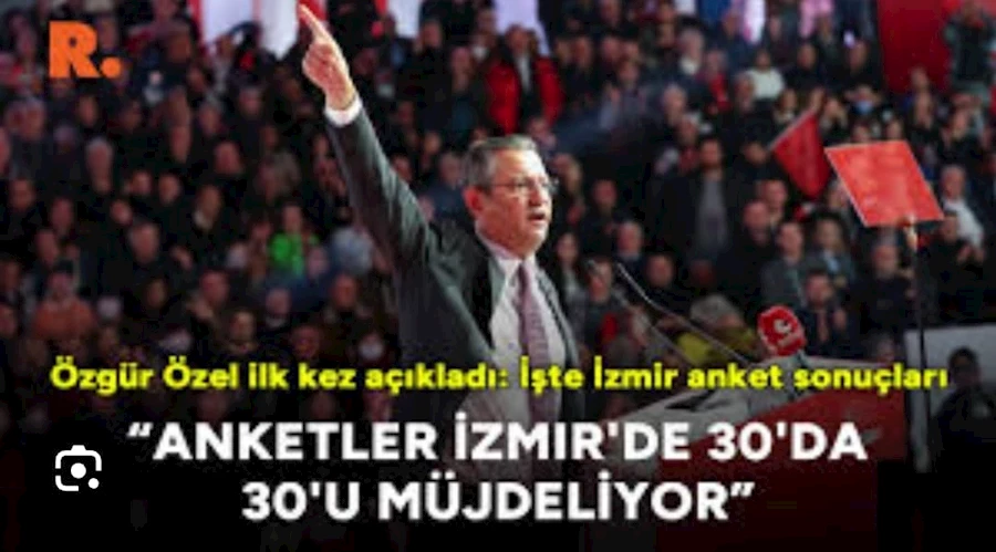 CHP Genel Başkanı Özgür Özel, partisinin İzmir aday tanıtım toplantısında yaptığı konuşmada "Bundan sonraki süreçte Cumhuriyet Halk Partisi'ni kimse küçük iktidar alanlarının partisi olarak görmesin" dedi. Özel, anket sonuçlarını da paylaşarak İzmir'de 30 ilçeyi de kazanacaklarını söyledi.