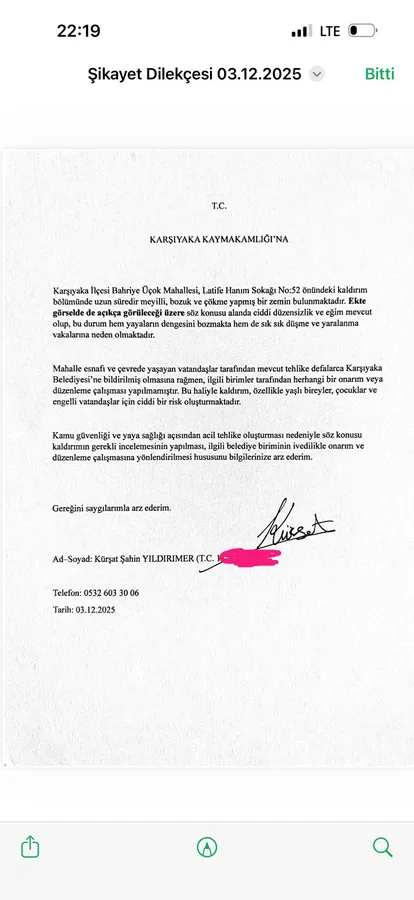 Kaza sonrası yapılan başvuruda, söz konusu kaldırımın yayalar açısından ciddi tehlike oluşturduğu, benzer olayların sık sık yaşandığı ve tekrar yaşanmaması için acilen onarılması gerektiği ifade edildi. Karşıyaka Kaymakamlığı, yapılan bildirim üzerine aynı gün Karşıyaka Belediyesi’ne yazı yazarak gerekli inceleme ve düzenlemelerin yapılmasını talep etti.